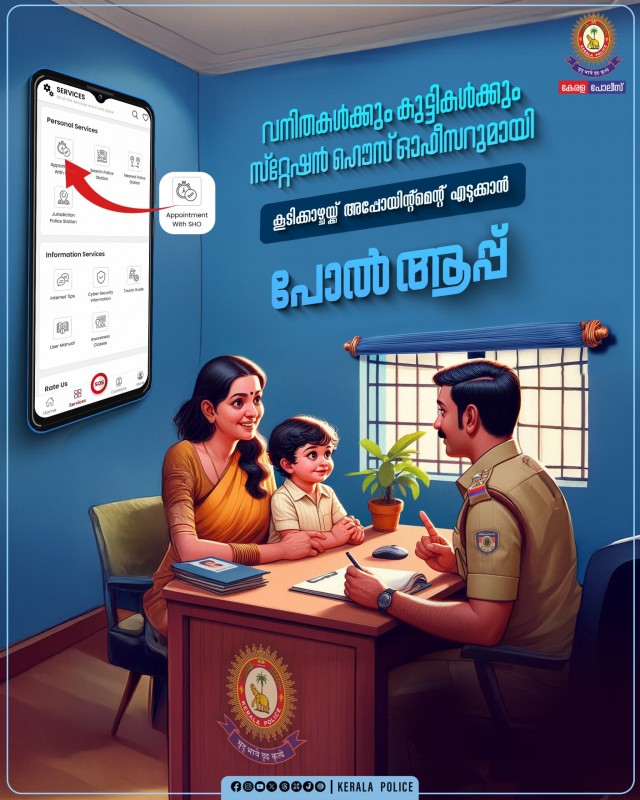 വനിതകൾക്കും കുട്ടികൾക്കും സ്റ്റേഷൻ ഹൌസ് ഓഫീസറുമായി കൂടിക്കാഴ്ച നടത്താൻ അപ്പോയിന്റ്മെന്റ് പോൽ ആപ്പ് വഴി എടുക്കാം.