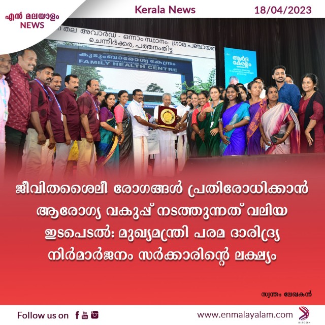 ജീവിതശൈലീ രോഗങ്ങള് പ്രതിരോധിക്കാന് ആരോഗ്യ വകുപ്പ് നടത്തുന്നത് വലിയ ഇടപെടല്: മുഖ്യമന്ത്രി പരമ ദാരിദ്ര്യ നിര്മാര്ജനം സര്ക്കാരിന്റെ ലക്ഷ്യം