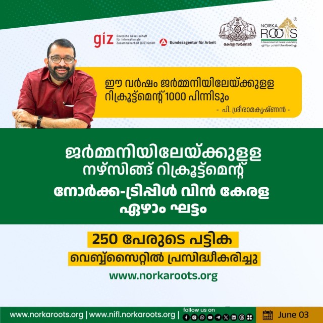 കേരളത്തില് നിന്നും ജര്മ്മനിയിലേയ്ക്കുളള നഴ്സിംങ് റിക്രൂട്ട്മെന്റ് പദ്ധതിയായ നോര്ക്ക ട്രിപ്പിള് വിന് കേരളയുടെ ഏഴാം എഡിഷനില് അഭിമുഖങ്ങളില് നിന്നും തിരഞ്ഞെടുത്ത 250 പേരുടെ പട്ടിക നോര്ക്ക റൂട്ട്സ് വെബ്സൈറ്റില് (www.norkaroots.org) പ്രസിദ്ധീകരിച്ചു. അപേക്ഷ നല്കിയ 4200 അപേക്ഷകരില് നിന്നും ഷോര്ട്ട് ലിസ്റ്റ് ചെയ്ത 360 പേരാണ് കൊച്ചിയിലും തിരുവനന്തപുരത്തുമായി നടന്ന അഭിമുഖങ്ങളില് പങ്കെടുത്തത്. ഇവരില് നിന്നുളള 250 പേരുടെ പട്ടികയാണ് പ്രസിദ്ധീകരിച്ചത്. ജര്മനിയിലെ ഫെഡറല് എംപ്ലോയ്മെന്റ് ഏജന്സിയുടെ കീഴിലുള്ള പ്ലേയ്സ്മെന്റ് ഉദ്യോഗസ്ഥര്മാര് നേരിട്ടെത്തിയായിരുന്നു അഭിമുഖം. ട്രിപ്പിള് വിന് പദ്ധതിയുടെ ഭാഗമായി 1000 പേരുടെ റിക്രൂട്ട്മെന്റെന്ന മികച്ച നേട്ടം ഈ വര്ഷം സാധ്യമാകുമെന്ന് നോര്ക്ക റൂട്ട്സ് റസിഡന്റ് വൈസ് ചെയര്മാന് പി. ശ്രീരാമകൃഷ്ണന് അഭിപ്രായപ്പെട്ടു.
