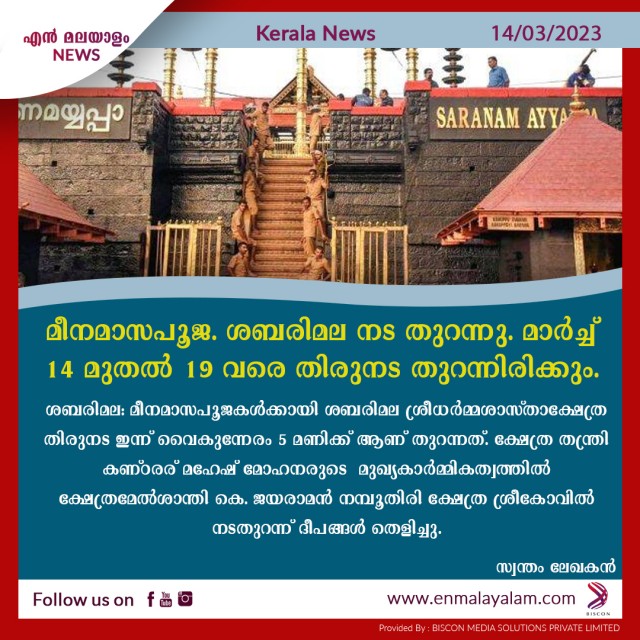 മീനമാസപൂജ. ശബരിമല നട തുറന്നു.. മാർച്ച് 14 മുതൽ 19 വരെ തിരുനട തുറന്നിരിക്കും.