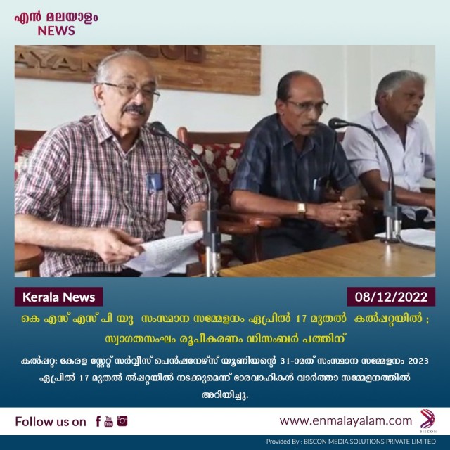 കല്പ്പറ്റ: കേരള സ്റ്റേറ്റ് സര്വ്വീസ് പെന്ഷനേഴ്സ് യൂണിയന്റെ 31-ാമത് സംസ്ഥാന സമ്മേളനം 2023 ഏപ്രില് 17 മുതല് ല്പ്പറ്റയില് നടക്കുമെന്ന് ഭാരവാഹികള് വാര്ത്താ സമ്മേളനത്തില് അറിയിച്ചു. സംസ്ഥാനത്തെ മൂന്നര ലക്ഷത്തോളം അംഗസംഖ്യയുള്ള സംഘടനയുടെ സംസ്ഥാന സമ്മേളനത്തിന്റെ വിജയകരമായ നടത്തിപ്പിന് ഡിസംബര് 10-ന് രാവിലെ 11 മണിക്ക് കല്പ്പറ്റ പെന്ഷന് ഭവനില് വെച്ച് വിപുലമായ സ്വാഗതസംഘം രൂപീകരിക്കും. കല്പ്പറ്റ നിയോജക മണ്ഡലം എം.എല്.എ. അഡ്വ.ടി. സിദ്ദിഖ് സ്വാഗത സംഘ രൂപീകരണ യോഗം ഉദ്ഘാടനം ചെയ്യും. ജില്ലയിലെ എം.എല്.എ.മാര്, ത്രിതല പഞ്ചായത്ത് ജനപ്രതിനിധികള്, സര്വ്വീസ്, ട്രേഡ് യൂണിയന് സംഘടനകള്, രാഷ്ട്രീയ പാര്ട്ടി പ്രതിനിധികള്, കലാസാംസ്കാരിക പ്രവര്ത്തകര്, യുവജന സംഘടനാ പ്രതിനിധികള്, കെ.എസ്.എസ്.പി.യു. സംസ്ഥാന ജില്ലാ ബ്ലോക്ക് യൂണിറ്റ് നേതാക്കള്, ജില്ല യിലെ സംഘടനാ പ്രവര്ത്തകര് തുടങ്ങിയവര് യോഗത്തില് പങ്കെടുക്കും. 1992-ല് സ്ഥാപിതമായ സംഘടനയുടെ കഴിഞ്ഞ മൂന്ന് പതിറ്റാണ്ട് കാലത്തെ പ്രവര്ത്തന ഫലമായി പെന്ഷന് സമൂഹത്തിന് അഭിമാനാര്ഹമായ ഒട്ടേറെ നേട്ടങ്ങള് കൈവരിക്കാന് കഴിഞ്ഞിട്ടുണ്ട്. കക്ഷി രാഷ്ട്രീയത്തിനും, ജാതിമത ചിന്തകള്ക്കും, സര്വ്വീസ് കാലത്തെ പദവി വ്യത്യാസങ്ങള്ക്കും അത് തമായി എല്ലാ പെന്ഷന്കാരും കുടുംബ പെന്ഷന്കാരും ഒരുമിച്ച് നിന്ന് പ്രവര്ത്തിച്ചതിന്റെ ഫലമാണിതെന്ന് ഭാരവാഹികള് പറഞ്ഞു. സര്വ്വീസ് പെന്ഷന്കാരുടെ ആനുകൂല്യങ്ങള് സംരക്ഷിക്കുന്നതോടൊപ്പം സാമൂഹ്യ പ്രശ്നങ്ങളില് ഇടപെട്ട് മൂന്നര ലക്ഷം അംഗങ്ങളെ സാമൂഹ്യ പ്രതിബന്ധതയുള്ളവരാക്കുന്നു. സ്ത്രീ ശാക്തീകരണവും, സ്ത്രീ സ്വാതന്ത്ര്യ വം സമത്വവും സാമൂഹ്യ നീതിയുടെ ഭാഗമാക്കാന് കെ.എസ്.എസ്. പി.യു. വനിതാ വേദി പ്രത്യേകം ശ്രദ്ധിക്കുന്നു. പെന്ഷന്കാരുടെ സര്ഗ്ഗ ചേതന നഷ്ട പ്പെട്ടു പോകാതിരിക്കാന്, സംഘടനയുടെ സാംസ്കാരിക വേദി, യൂണിറ്റ് തല കുടുംബ മേളകള് നടത്തി പെന്ഷന്കാരുടെ തനതായ കഴിവുകളെ പ്രോത്സാഹിപ്പിച്ചു വരുന്നുണ്ട്. പൊതു സമൂഹം നേരിടുന്ന നിരവധി പ്രശ്നങ്ങളില് കെ.എസ്.എസ്.പി. യും ഇടപെടുന്നുണ്ട്. ദുര്ബ്ബല വിഭാഗങ്ങള്ക്ക് പെന്ഷന്, മാരക രോഗം പിടിപെ ടുന്നവര്ക്ക് ചികിത്സാ സഹായം എന്നിവയ്ക്കായി പ്രത്യേകം നിധി രൂപീകരിച്ചു. സാമ്പത്തിക സഹായം നല്കി വരുന്നു. അവയവദാനം, മാലിന്യ സംസ്കരണം, ജലസംരക്ഷണ പ്രവര്ത്തനങ്ങള് എന്നിവയെല്ലാം കെ.എസ്.എസ്. പി.യു. ഏറ്റെടുത്ത പരിപാടികളാണ്. ത്രിതല പഞ്ചായത്തുകളില് ആസൂത്രണ സമിതികളില് പ്രവര്ത്തിക്കല്, നവകേരള നിര്മ്മിതി ദൗത്യം വിജയിപ്പിക്കല്, പാലിയേറ്റീവ് കെയര്, ഡയാലിസിസ് യൂണിറ്റുകള് സ്ഥാപിക്കല് എന്നിവയൊക്കെ കെ.എസ്. എസ്. പി.യു. വിന്റെ പ്രവര്ത്തന മേഖലകളാണ്. രാജ്യം നേരിട്ട പ്രതിസന്ധി ഘട്ടങ