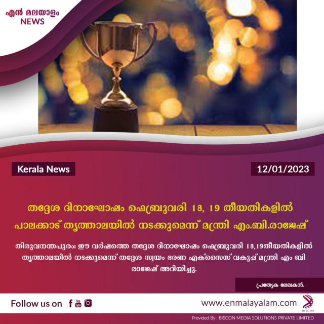 തദ്ദേശ ദിനാഘോഷം ഫെബ്രുവരി 18, 19 തീയതികളില് പാലക്കാട് തൃത്താലയില് നടക്കുമെന്ന് മന്ത്രി .എം.ബി.രാജേഷ്