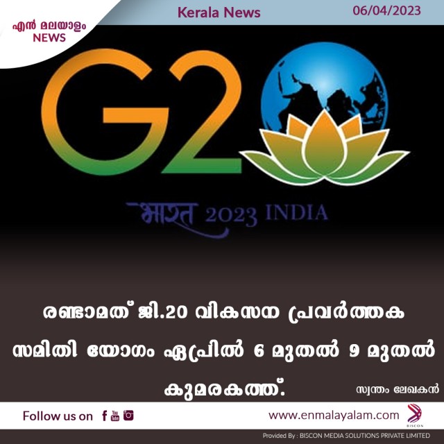 രണ്ടാമത് ജി.20 വികസന പ്രവർത്തക സമിതി യോഗം ഏപ്രില് 6 മുതല് 9 മുതൽ കുമരകത്ത്.
