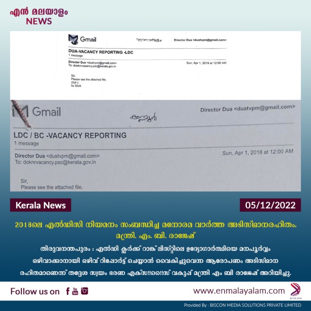 തിരുവനന്തപുരം : എൽഡി ക്ലർക്ക് റാങ്ക് ലിസ്റ്റിലെ ഉദ്യോഗാർത്ഥിയെ മനപൂർവ്വം ഒഴിവാക്കാനായി ഒഴിവ് റിപ്പോർട്ട് ചെയ്യാൻ വൈകിച്ചുവെന്ന ആരോപണം അടിസ്ഥാന രഹിതമാണെന്ന് തദ്ദേശ സ്വയം ഭരണ എക്സൈസ് വകുപ്പ് മന്ത്രി എം ബി രാജേഷ് അറിയിച്ചു. മലയാള മനോരമയിലെ വാർത്ത ശ്രദ്ധയിൽപെട്ടയുടനെ തന്നെ ഈ വിഷയത്തിൽ റിപ്പോർട്ട് തേടിയിരുന്നു. റാങ്ക് ലിസ്റ്റ് അവസാനിക്കുന്നതിന്റെ രണ്ട് ദിവസം മുമ്പ് 2018 മാർച്ച് 28ന് എൻജെഡി ഒഴിവുകൾ ഉൾപ്പെടെ ഏതാനും LDC ഒഴിവുകൾ റിപ്പോർട്ട് ചെയ്തിരുന്നു. 6 ജില്ലകളിലായി 12 ഒഴിവുകളാണ് ഇപ്രകാരം റിപ്പോർട്ട് ചെയ്തത്. മാർച്ച് 29, 30 തീയ്യതികൾ അവധി ദിനങ്ങളായിരുന്നു. 14 ജില്ലകളിലെയും ക്ലാർക്കുമാരുടെ നിയമന ചുമതലയുള്ള ഉദ്യോഗസ്ഥന്മാർ നിയമനത്തിനുള്ള നടപടി യുദ്ധകാലടിസ്ഥാനത്തിൽ പൂർത്തിയാക്കുന്നതിന് ഈ ദിവസങ്ങളിൽ നടപടി സ്വീകരിച്ചിരുന്നു. വകുപ്പ് തലവന്റെ അനുമതി ലഭിക്കാൻ അദ്ദേഹത്തിന്റെ താമസസ്ഥലത്ത് പോയി രാത്രി 11:30 നാണ് ഒപ്പിടീച്ചത്. തുടർന്ന് എല്ലാ ജില്ലാ ഓഫീസിലേക്കും 11:36 മുതൽ ഇമെയിൽ വഴി ഒഴിവ് റിപ്പോർട്ട് ചെയ്തിരുന്നു. കണ്ണൂർ, ഏറണാകുളം ജില്ലകൾക്ക് അയക്കുന്നത് രാത്രി 12 നാണ്. കണ്ണൂരിൽ നിയമനം നൽകി ,ഏറണാകുളത്ത് മെയിൽ കിട്ടിയസമയം 12 മണി 4 സെക്കന്റ് ആണ് എന്ന് പറഞ്ഞ് പിഎസ്സി നിയമനം നൽകിയില്ല. അയച്ച മെയിലിലെ സമയം 12 മണി എന്ന് വ്യക്തമാക്കുന്ന തെളിവുകളുണ്ട്. ഇതുമായി ബന്ധപ്പെട്ട സ്ക്രീൻഷോട്ടുകളും ഇതോടൊപ്പം ചേർത്തിട്ടുണ്ട്