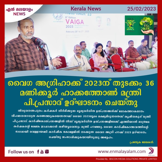 വൈഗ അഗ്രി ഹാക്ക് 2023-ന് തുടക്കം 36 മണിക്കൂർ ഹാക്കത്തോൺ മന്ത്രി പി.പ്രസാദ് ഉദ്ഘാടനം ചെയ്തു