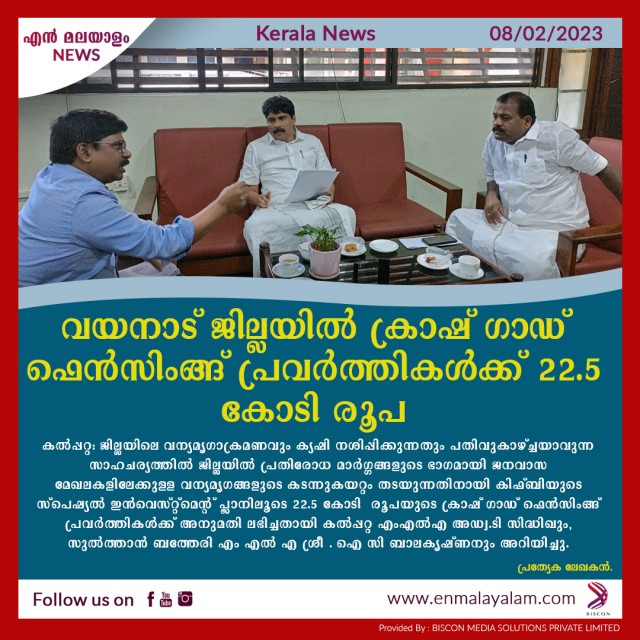 വയനാട് ജില്ലയിൽ ക്രാഷ് ഗാഡ് ഫെൻസിംങ്ങ് പ്രവർത്തികൾക്ക് 22.5 കോടി രൂപ