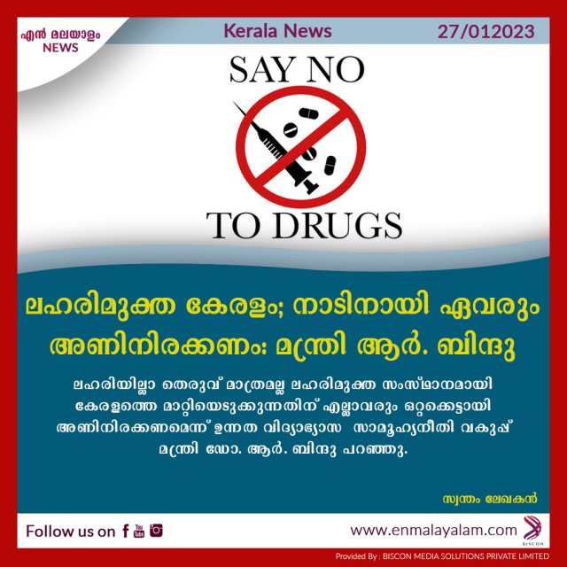 ലഹരിമുക്ത കേരളം; നാടിനായി ഏവരും അണിനിരക്കണം. മന്ത്രി ആര്. ബിന്ദു