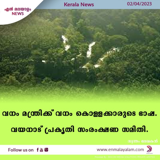 വനം മന്ത്രിക്ക് വനം കൊള്ളക്കാരുടെ ഭാഷ. വയനാട് പ്രകൃതി സംരംക്ഷണ സമിതി.