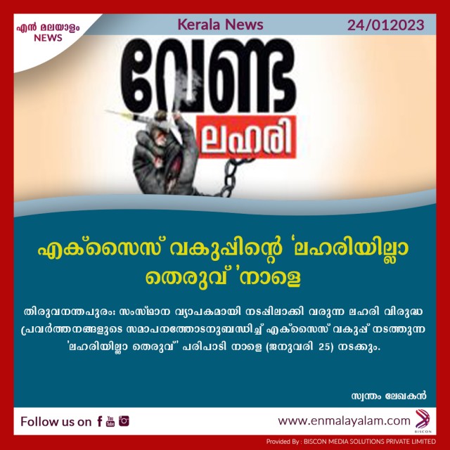 തിരുവനന്തപുരം: സംസ്ഥാന വ്യാപകമായി നടപ്പിലാക്കി വരുന്ന ലഹരി വിരുദ്ധ പ്രവർത്തനങ്ങളുടെ സമാപനത്തോടനുബന്ധിച്ച് എക്സൈസ് വകുപ്പ് നടത്തുന്ന 'ലഹരിയില്ലാ തെരുവ്' പരിപാടി നാളെ (ജനുവരി 25) നടക്കും. വൈകീട്ട് 4 മണിക്ക് കോഴിക്കോട് ബീച്ച് ഫ്രീഡം സ്ക്വയറിന് പിൻവശത്ത് നടക്കുന്ന പരിപാടി വിമുക്തി മിഷന്റെ നേതൃത്വത്തിൽ ജില്ലാ ഭരണകൂടവുമായി ചേർന്നാണ് സംഘടിപ്പിക്കുന്നത്.