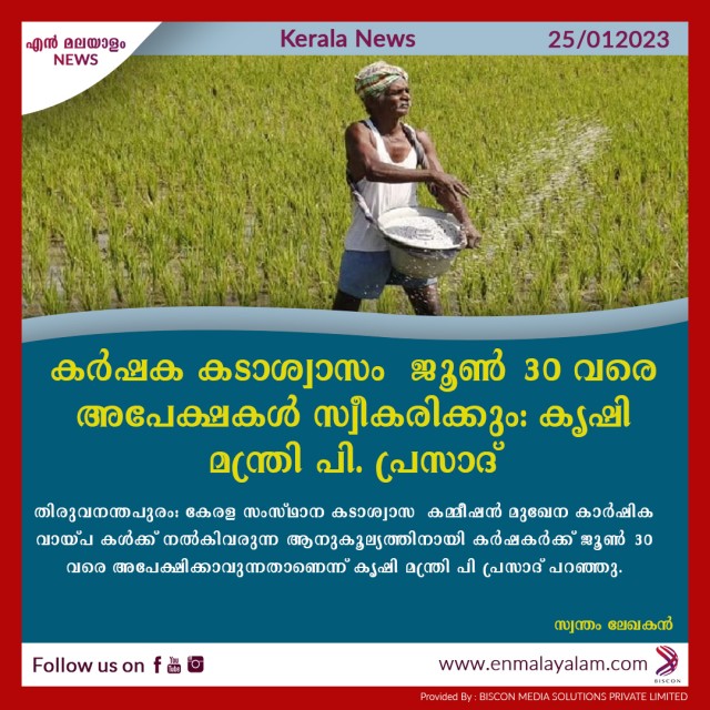 തിരുവനന്തപുരം: കേരള സംസ്ഥാന കടാശ്വാസ കമ്മീഷൻ മുഖേന കാർഷിക വായ്പ കൾക്ക് നൽകിവരുന്ന ആനുകൂല്യത്തിനായി കർഷകർക്ക് ജൂൺ 30 വരെ അപേക്ഷിക്കാവുന്നതാണെന്ന് കൃഷിമന്ത്രി പി പ്രസാദ് പറഞ്ഞു.