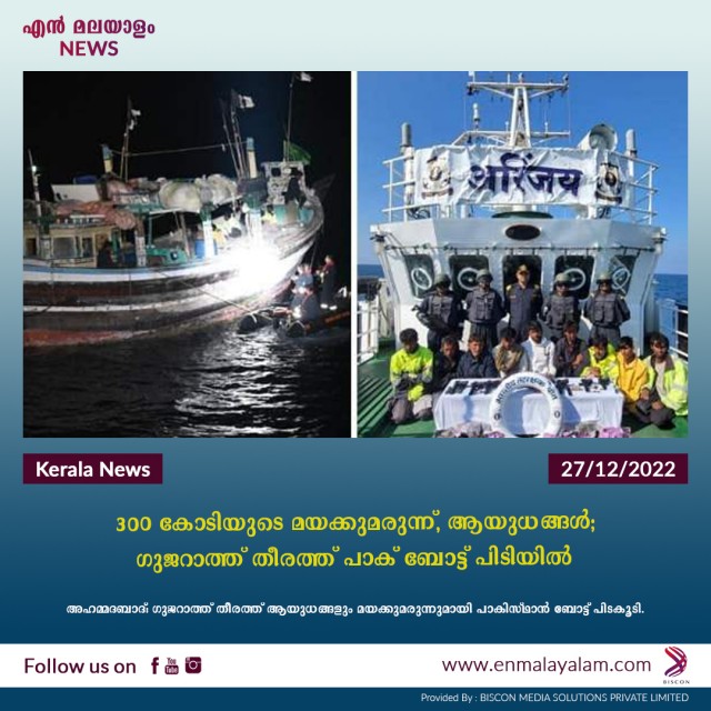 അഹമ്മദബാദ്: ഗുജറാത്ത് തീരത്ത് ആയുധങ്ങളും മയക്കുമരുന്നുമായി പാകിസ്ഥാന് ബോട്ട് പിടകൂടി. കോസ്റ്റ് ഗാര്ഡും ഗുജറാത്ത് എടിഎസും ചേര്ന്ന നടത്തിയ ഓപ്പറേഷനിലാണ് ബോട്ട് പിടിയിലായത്. ബോട്ടില് നിന്ന് 300 കോടി വിലവരുന്ന മയക്കുമരുന്നും ആറ് പിസ്റ്റളുകളും പിടിച്ചെടുത്തതായി ഇന്ത്യന് കോസ്റ്റ് ഗാര്ഡ് ട്വിറ്ററിലൂടെ വ്യക്കമാക്കി. അല് സൊഹൈല് എന്ന മത്സ്യ ബന്ധന ബോട്ടില് പത്തുപേരുണ്ടായിരുന്നു. ഇവര് നിലവില് കോസ്റ്റ് ഗാര്ഡിന്റെ കസ്റ്റഡിയിലാണുള്ളത്. ഇവരെയും ബോട്ടിനെയും ഓഖയിലെത്തിച്ച് കൂടുതല് പരിശോധന നടത്തുമെന്ന് കോസ്റ്റ് ഗാര്ഡ് വ്യക്തമാക്കി. ഇന്ത്യയിലേക്ക് മയക്കുമരുന്നുകളും ആയുധങ്ങളുമായി പാക് സംഘം എത്തുമെന്ന രഹസ്യാന്വേഷണ വിഭാഗത്തിന്റെ മുന്നറിയിപ്പിനെ തുടര്ന്ന് ക്രിസ്മസ് ദിനത്തില് ഗുജറാത്ത് തീരത്ത് പരിശോധന ശക്തമാക്കിയിരുന്നു. തിങ്കളാഴ്ച വെളുപ്പിനാണ് ബോട്ട് ഇന്ത്യന് ഉദ്യോഗസ്ഥരുടെ ശ്രദ്ധയില്പ്പെട്ടത്. നിര്ത്താന് ആവശ്യപ്പെട്ടിട്ടും നിര്ത്താതെ പോയ ബോട്ടിനെ ഐസിജിഎസ് അരിഞ്ജയ് കപ്പലില് എത്തിയ കോസ്റ്റ് ഗാര്ഡ്-എടിഎസ് സംഘം പിടികൂടുകയായിരുന്നെന്ന് കോസ്റ്റ് ഗാർഡ് വ്യക്തമാക്കി.