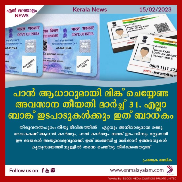 പാൻ ആധാറുമായി ലിങ്ക് ചെയ്യേണ്ട അവസാന തീയതി മാർച്ച് -31. എല്ലാ ബാങ്ക് ഇടപാടുകൾക്കും ഇത് ബാധകം
