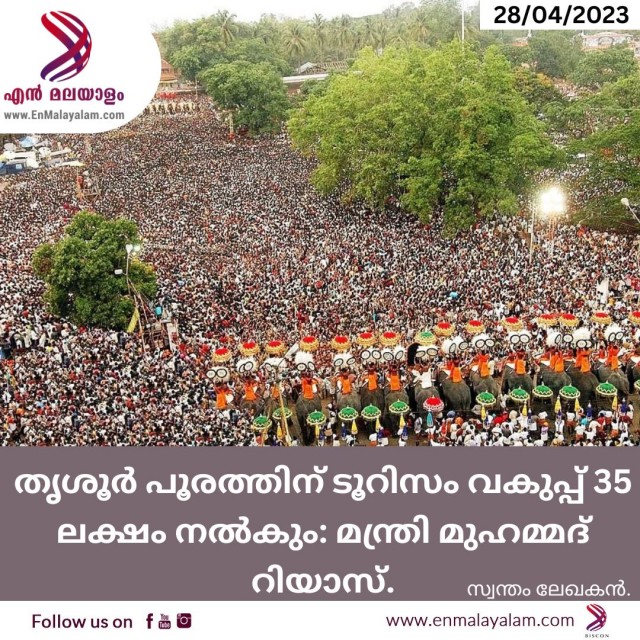തൃശൂര് പൂരത്തിന് ടൂറിസം വകുപ്പ് 35 ലക്ഷം നല്കും: മന്ത്രി മുഹമ്മദ് റിയാസ്.