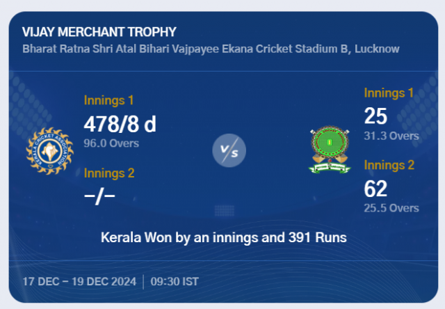 വിജയ് മർച്ചൻ്റ് ട്രോഫി: മേഘാലയയെ ഒരിന്നിങ്സിനും 391 റൺസിനും തോല്പിച്ച് കേരളം.
