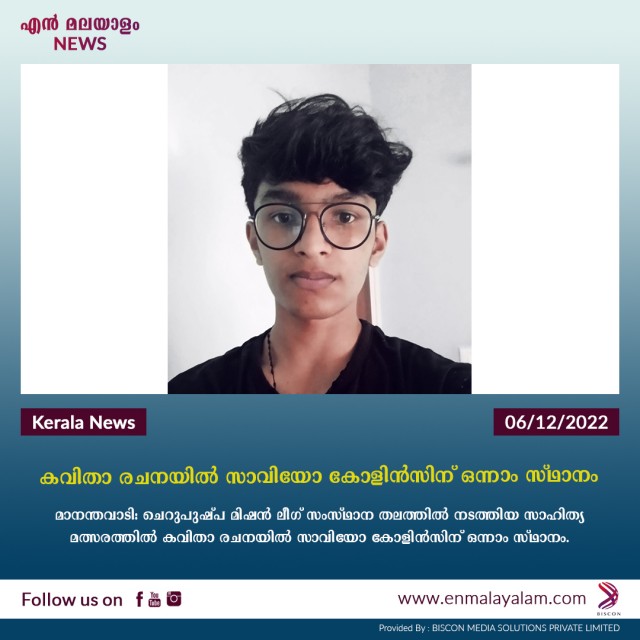 മാനന്തവാടി: ചെറുപുഷ്പ മിഷൻ ലീഗ് സംസ്ഥാന തലത്തിൽ നടത്തിയ സാഹിത്യ മത്സരത്തിൽ കവിതാ രചനയിൽ സാവിയോ കോളിൻസിന് ഒന്നാം സ്ഥാനം . വെള്ളമുണ്ട ഒഴുക്കൻമൂല മാനിക്കൽ ജോർജ് കോളിൻസിൻ്റെ മകനാണ്.
