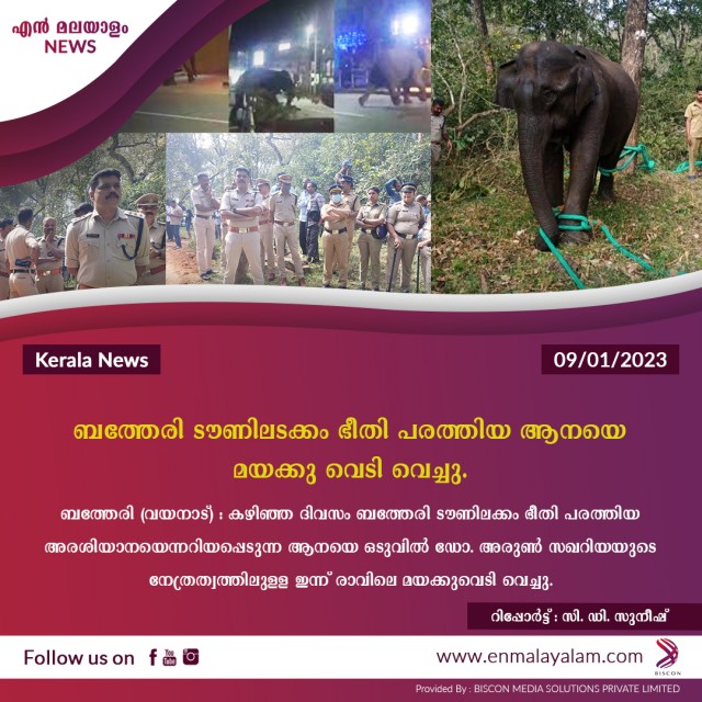 ബത്തേരി (വയനാട്) : കഴിഞ്ഞ ദിവസം ബത്തേരി ടൗണിലക്കം ഭീതി പരത്തിയ അരശിയാനയെന്നറിയപ്പെടുന്ന ആനയെ ഒടുവിൽ ഡോ. അരുൺ സഖറിയയുടെ നേത്രത്വത്തിലുള്ള ഇന്ന് രാവിലെ മയക്കുവെടി വെച്ചു. ജനവാസ മേഖലകളിൽ കടന്ന് ചെന്ന് ഏറെ ഭീതി പരത്തിയ ആനയെ മയക്കു വെടി വെക്കാൻ വനം വകുപ്പ് ഉത്തരവിറക്കിയിരുന്നു. ആനയെ മയക്കുവെടിവെച്ച് പിടികൂടാനായി പ്രവർത്തിച്ച ദൗത്യസംഘത്തെ പ്രത്യേകം അഭിനന്ദിക്കുന്നതായി വനം വകുപ്പു മന്ത്രി എ. കെ. ശശീന്ദ്രൻ അറിയിച്ചു.