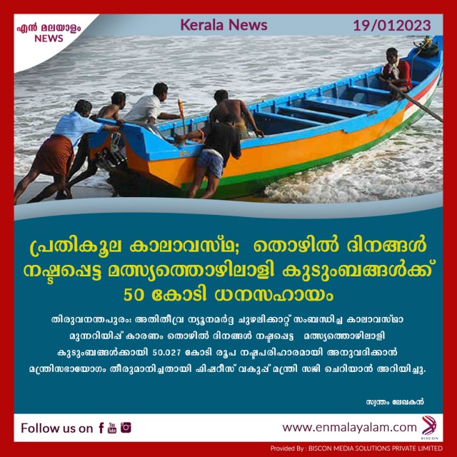 പ്രതികൂല കാലാവസ്ഥ; തൊഴിൽ ദിനങ്ങൾ നഷ്ടപ്പെട്ട മത്സ്യത്തൊഴിലാളി കുടുംബങ്ങൾക്ക് 50 കോടി ധനസഹായം
