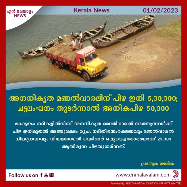 കോട്ടയം: നദികളിൽനിന്ന് അനധികൃത മണൽവാരൽ നടത്തുന്നവർക്ക് പിഴ ഇനിമുതൽ അഞ്ചുലക്ഷം രൂപ. നദീതീരസംരക്ഷണവും മണൽവാരൽ നിയന്ത്രണവും നിയമഭേദഗതി ഗവർണർ ഒപ്പുവെച്ചതോടെയാണ് 25,000 ആയിരുന്ന പിഴയുയർന്നത്. ചട്ടലംഘനം തുടരുന്ന ഓരോ ദിവസവും അധികപിഴ 50,000 രൂപയായും ഉയർത്തി. നേരത്തേ 1000 രൂപയായിരുന്നു. കണ്ടുകെട്ടുന്ന മണൽ പൊതുമരാമത്ത് വകുപ്പ് നിശ്ചയിക്കുന്ന നിരക്കിൽ നിർമിതികേന്ദ്രത്തിനോ കലവറയ്ക്കോ വിൽക്കണമെന്ന വ്യവസ്ഥയും ഭേദഗതിചെയ്തു. കളക്ടർ വിലനിശ്ചയിച്ച് സ്ഥാപനങ്ങൾക്കോ വ്യക്തികൾക്കോ ലേലത്തിലൂടെ വിൽക്കാമെന്നതാണ് പുതിയ വ്യവസ്ഥ.