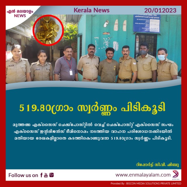 മുത്തങ്ങ എക്സൈസ് ചെക്ക്പോസ്റ്റിൽ വെച്ച് ചെക്പോസ്റ്റ് എക്സൈസ് സംഘം എക്സൈസ് ഇന്റലിജൻസ് ടീമിനൊപ്പം നടത്തിയ വാഹന പരിശോധനക്കിടയിൽ മതിയായ രേഖകളില്ലാതെ കടത്തികൊണ്ടുവന്ന 519.80ഗ്രാം സ്വർണ്ണം പിടികൂടി. സ്വർണ്ണം കടത്തിയ കോഴിക്കോട് സ്വദേശി ശ്രുതി വീട്ടിൽ ആദിത്യ വിനയ് ജാഥവ് എന്നയാളെ കസ്റ്റഡിയിൽ എടുത്തു. കണ്ടെത്തിയ സ്വർണ്ണം തുടർനടപടികൾക്കായി ജി.എസ്.ടി എൻഫോഴ്സ്മെന്റ് ഓഫീസർക്ക് കൈമാറി. എക്സൈസ് സർക്കിൾ ഇൻസ്പെക്ടർ ഷറഫുദ്ദീൻ.ടി, എക്സൈസ് ഇൻസ്പെക്ടർ ഷഫീഖ്.ടി.എച്ച്, പ്രിവന്റീവ് ഓഫീസർമാരായ രാജേഷ്. എം, അനിൽകുമാർ.കെ സിവിൽ എക്സൈസ് ഓഫീസർമാരായ ഷാഫി.ഒ, അനിൽ എന്നിവർ പരിശോധനയിൽ പങ്കെടുത്തു.
