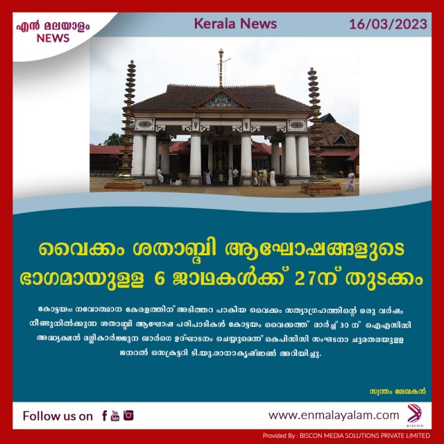 വെെക്കം ശതാബ്ദി ആഘോഷങ്ങളുടെ ഭാഗമായുള്ള 6 ജാഥകള്ക്ക് 27ന് തുടക്കം