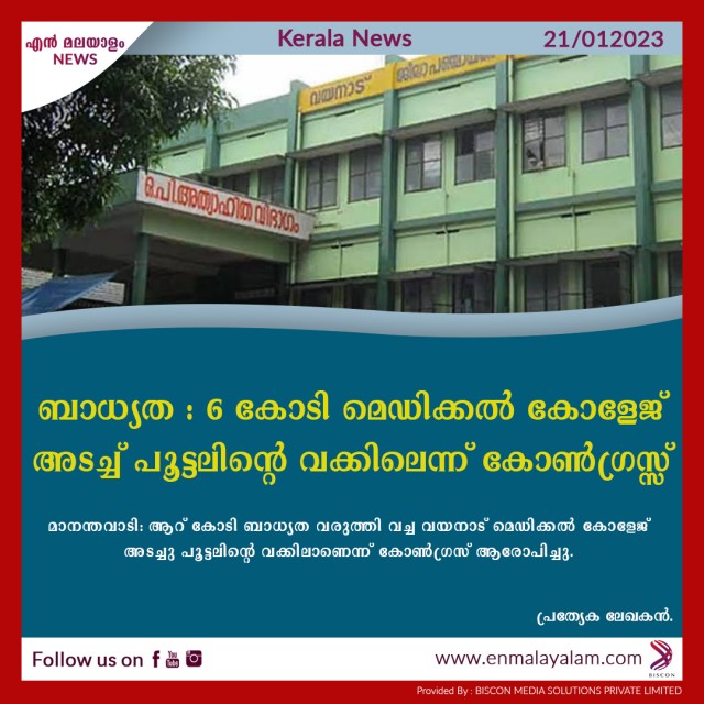 ബാധ്യത : 6 കോടി മെഡിക്കൽ കോളേജ് അടച്ച് പൂട്ടലിന്റെ വക്കിലെന്ന് കോൺഗ്രസ്സ്