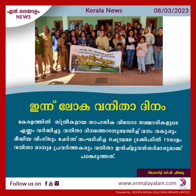 കേരളത്തിൽ സ്ത്രീകളായ സാഹസിക വിനോദ സഞ്ചാരികളുടെ എണ്ണം വർദ്ധിച്ചു.വനിതാ ദിനത്തോടനുബന്ധിച്ച് വനം വകുപ്പും മീഡിയ വിംഗ്സും ചേർന്ന് സംഘടിപ്പിച്ച ചെമ്പ്രമല ട്രക്കിംഗിൽ 75-ഓളം വനിതാ മാധ്യമ പ്രവർത്തകരും വനിതാ ഇൻഫ്ളുവൻസർമാരുമാ ണ് പങ്കെടുത്തത്. ഇവർ കേരളത്തിൻ്റെ നാനാഭാഗത്ത് നിന്ന് വയനാട്ടിൽ ഒരുമിച്ചുകൂടിയവർ. ഏഴ് മാസം ഗർഭിണിയായ സുമിയും ഒന്നര വയസ്സുകാരിയുടെ അമ്മയായ നൂറയും മുതൽ 65 കാരിയായ വരെ ഉള്ള സംഘത്തിൽ ഭൂരിഭാഗം പേരും മാധ്യമ പ്രവർത്തകരും ഇൻഫ്ളുവൻസേഴ്സും.