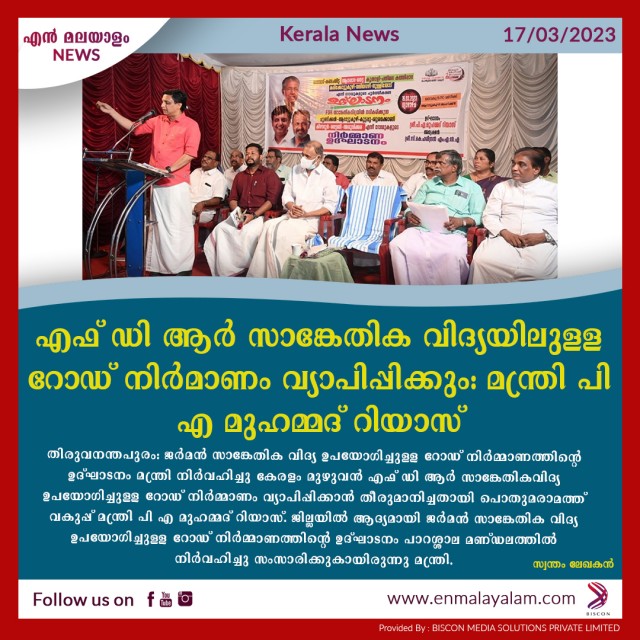 എഫ് ഡി ആർ സാങ്കേതിക വിദ്യയിലുള്ള റോഡ് നിർമാണം വ്യാപിപ്പിക്കും: മന്ത്രി പി എ മുഹമ്മദ് റിയാസ്