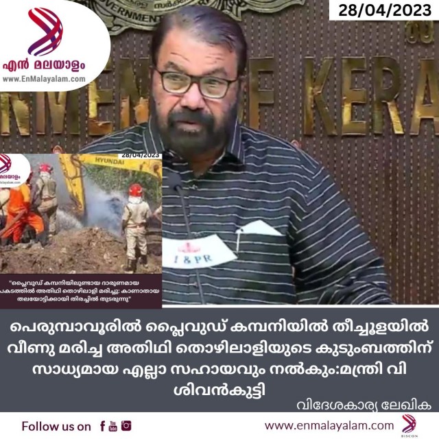പെരുമ്പാവൂരിൽ പ്ലൈവുഡ് കമ്പനിയിൽ തീച്ചൂളയിൽ വീണു മരിച്ച അതിഥി തൊഴിലാളിയുടെ കുടുംബത്തിന് സാധ്യമായ എല്ലാ സഹായവും നൽകും:മന്ത്രി വി ശിവൻകുട്ടി