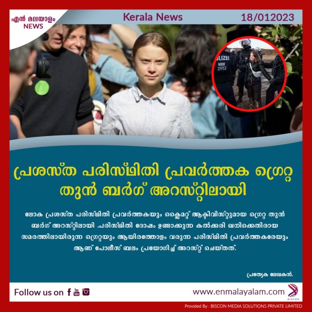 ലോക പ്രശസ്ത പരിസ്ഥിതി പ്രവർത്തകയും ക്ലൈമറ്റ് ആക്ടിവിസ്റ്റുമായ ഗ്രെറ്റ തുൻ ബർഗ് അറസ്റ്റിലായി .പരിസ്ഥിതി ദോഷം ഉണ്ടാക്കുന്ന കൽക്കരി ഖനിക്കെതിരായ സമരത്തിലായിരുന്ന ഗ്രെറ്റയും ആയിരത്തോളം വരുന്ന പരിസ്ഥിതി പ്രവർത്തകരേയും ആണ് പോലീസ് ബലം പ്രയോഗിച്ച് അറസ്റ്റ് ചെയ്തത്.