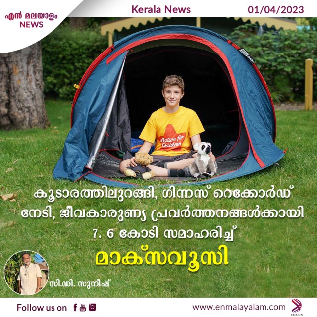 മൂന്ന് വർഷകാലം രാത്രി മുഴുവൻ കൂടാരത്തിലുറങ്ങി 13 വയസ് കാരൻ മാക്സ് വൂസി സമാഹരിച്ചത് 7. 6 കോടി രൂപ. ഗിന്നസ് റെക്കോർഡ് നേടിയ ഈ 13 കാരൻ ഈ തുക ജീവകാരുണ്യ പ്രവർത്തനങ്ങൾക്കായിയാണ് ചിലവഴിക്കുക. ലണ്ടനിലെ ജീവകാരുണ്യ പ്രസ്ഥാനമായ നോർത്ത് ഡെമൺ ഹോസ്പൈസിനായാണ് ഈ കാരുണ്യ പ്രവർത്തി ചെയ്ത് ഈ 13 കാരൻ ലോക മാതൃകയായത്. പത്താം വയസ്സിൽ ഈ കൂടാര വാസം തുടങ്ങിയത്. കുടുംബ സുഹൃത്തായ റിക്ക് ആബട്ടിന്റെ മരണം വൂസിയെ ഈ കാരുണ്യ വഴിയിലെത്തിച്ചു. ലോകം മുഴുവൻ ,, ദ ബോയ് ഇൻ ടെന്റ്,, എന്ന പേരിൽ വൂസിഅറിയപ്പെട്ടു. ലോകത്തെ ശ്രദ്ധേയരായ വ്യക്തിത്വങ്ങൾക്കൊപ്പം ചിലവഴിക്കാൻ ഭാഗ്യം ലഭിച്ച വൂസിക്ക് മുൻ പ്രധാനമന്ത്രി ബോറിസ് ജോൺസനൊപ്പം ചായ സൽക്കാരത്തിലും പങ്കെടുക്കാൻ ഉള്ള ഭാഗ്യം ലഭിച്ചു. ലോകത്തെ കാരുണ്യ പ്രവർത്തനങ്ങളിലെ ഈ സർഗ്ഗാത്മക മാതൃക ഗിന്നസ്സിലും ഇടം നേടി സവിശേഷ ശ്രദ്ധയും നേടി.