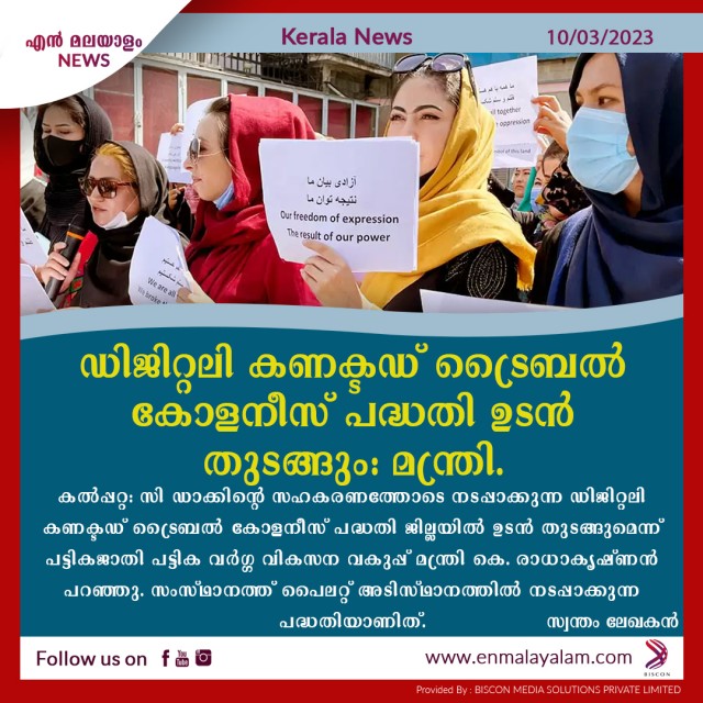 ഡിജിറ്റലി കണക്ടഡ് ട്രൈബല് കോളനീസ് പദ്ധതി ഉടന് തുടങ്ങും - മന്ത്രി.