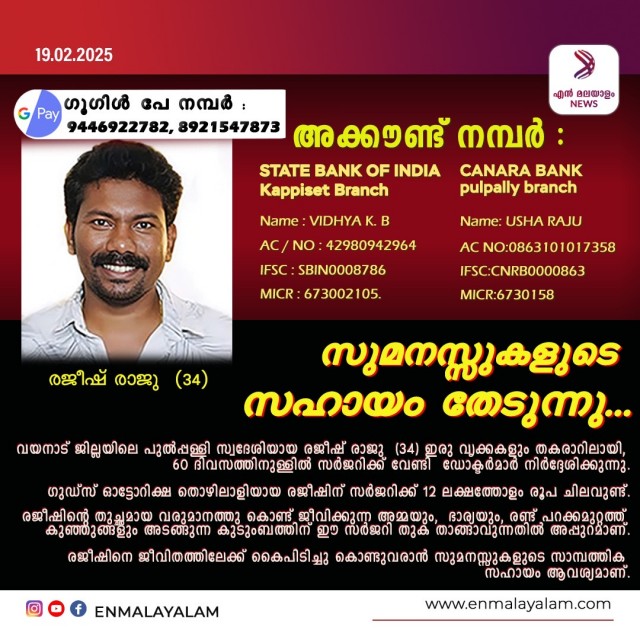 രജീഷ് ന്റെ ജീവന് നിലനിര്ത്താനും സാധാരണ ജീവിതത്തിലേക്ക് തിരിച്ചുകൊണ്ടുവരാനുമായി അടിയന്തിര വൃക്ക മാറ്റിവെക്കൽ ശസ്ത്രക്രിയയാണ് ഡോക്ടര്മാര് നിര്ദേശിച്ചിരിക്കുന്നത്. നിലവില് കോഴിക്കോട് ഗവ. മെഡിക്കല് കോളേജ് ആശുപത്രിയില് ചികിത്സയിലാണ് രജീഷ്. ഭാര്യയും പറക്ക മുറ്റാത്ത രണ്ടു മക്കളുമടങ്ങിയ കുടുംബത്തിന്റെ ഏക അത്താണിയായ രജീഷ് പുല്പ്പള്ളിയില് ഗുഡ്സ് ഓട്ടോറിക്ഷാ തൊഴിലാളിയാണ് . രജീഷിനുള്ള വൃക്ക പകുത്തുനല്കാന് അമ്മ ഉഷ രാജു തയ്യാറാണ്. 60 ദിവസത്തിനുള്ളില് വൃക്കമാറ്റി വെയ്ക്കേണ്ടതുണ്ട്. പക്ഷെ ശസ്ത്രക്രിയക്കും തുടര്ചികിത്സയ്ക്കുമായി 12 ലക്ഷത്തോളം രൂപ ചെലവുണ്ട്. ഇത്രയും ഭാരിച്ച തുക രജീഷിന്റെ നിര്ധന കുടുംബത്തിന് താങ്ങാവുന്നതിനും അപ്പുറമാണ്.