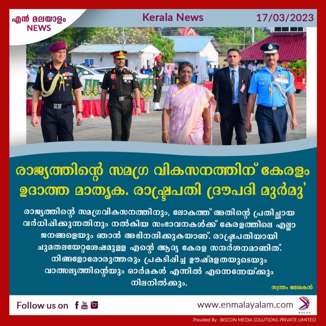 രാജ്യത്തിൻ്റെ സമഗ്ര വികസനത്തിന് കേരളം ഉദാത്ത മാതൃക. രാഷ്ട്രപതി ദ്രൗപദി മുർമു '