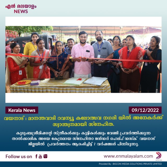 ഊരുകളിൽ എല്ലാ മേഖലയിലെയും പ്രവർത്തനം കാര്യക്ഷമമാക്കാൻ വിവിധങ്ങളായ ഇടപെടലുകൾ നടത്തുന്നതിന് സ്നേഹിതയുടെ കോളനി സന്ദർശനം മൂലം സാധിക്കുന്നു. മാനന്തവാടി റവന്യൂ കലോത്സവത്തിൽ സ്നേഹിതയുടെ സ്വാന്തന പ്രവർത്തനങ്ങൾ അനേകർക്ക് മന:ക്കരുത്ത് പകരുന്നു. മാനന്തവാടി വയനാട് ജില്ലാ സ്കൂൾ കലോത്സവത്തിലെ മത്സരാർത്ഥികൾക്കും,രക്ഷിതാക്കൾക്കും ആശ്വാസം പകരാൻ കുടുംബശ്രീ മിഷന്റെ നേതൃത്വത്തിൽ സ്നേഹിത ജൻഡർ ഹെല്പ് ഡസ്ക് കണിയാരം സ്കൂളിൽ വേദി ഒന്നിന് സമീപം ആരംഭിച്ചു.വയനാട് റെവന്യൂ ജില്ലാ സ്കൂൾ കലോത്സവം നടക്കുന്ന ഡിസംബർ 7,8,9 എന്നീ മൂന്ന് ദിവസങ്ങളിലായി സ്നേഹിത ഹെൽപ് ഡെസ്കിൻ്റേ സേവനം കലോത്സവ വേദിയിൽ ലഭ്യമാക്കു ക.മത്സരത്തിൻ്റെ മാനസിക പിരിമുറുക്കം അനുഭവിക്കുന്ന മത്സരാർഥികൾ, അവരുടെ മാതാപിതാക്കൾ എന്നിവർക്ക് ആവശ്യമായ മാനസിക പിന്തുണ ഉറപ്പ് വരുത്തുക, സ്നേഹിതയുടെ സേവനങ്ങൾ എന്നിവയെക്കുറിച്ചുള്ള ബോധവൽക്കരണം നടത്തുക എന്നിങ്ങനെയാണ് കലോത്സവ വേദിയിലെ സ്റ്റാൾ കൊണ്ടുദ്ദേശിക്കുന്നത് .