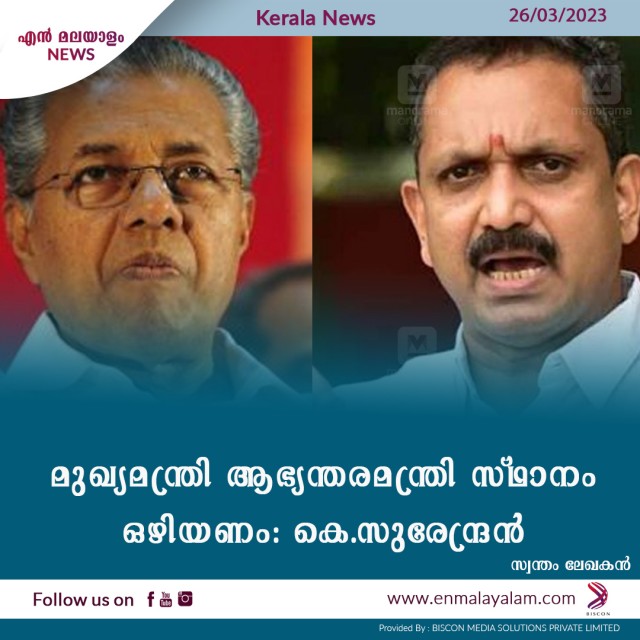 മുഖ്യമന്ത്രി ആഭ്യന്തരമന്ത്രി സ്ഥാനം ഒഴിയണം: കെ.സുരേന്ദ്രൻ.