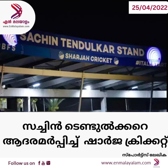 ഷാർജ: മാസ്റ്റർ ബ്ലാസ്റ്റർ സച്ചിൻ ടെണ്ടുൽക്കറുടെ അമ്പതാം പിറന്നാൾ ദിനത്തിൽ ആദരവുമായി ഷാർജ ക്രിക്കറ്റ്. 1998 ഏപ്രിൽ 22-ന് ഷാർജ സ്റ്റേഡിയത്തിൽ സച്ചിൻ നേടിയ സെഞ്ചുറിയുടെ ഇരുപത്തിയഞ്ചാം വാർഷികത്തോടനുബന്ധിച്ചു ഷാർജ ക്രിക്കറ്റ് സിഇഒ ഖലഫ് ബുഖാതിറാണ് സച്ചിൻ ടെണ്ടുൽക്കർ stand അനാവരണം ചെയ്തത്. ഓസ്ട്രേലിയക്കെതിരെ കൊക്കോ കോള കപ്പ് ത്രിരാഷ്ര പരമ്പരയിലാണ് 'ഡെസേർട് സ്റ്റോമ്'' എന്ന പ്രശസ്തമായ സെഞ്ച്വറി സച്ചിൻ കുറിച്ചത്. സച്ചിന്റെ സെഞ്ച്വറിയോടുകൂടി ത്രിരാഷ്ട്ര പരമ്പരയിൽ ഇന്ത്യ അന്ന് കിരീടം സ്വന്തമാക്കി. സച്ചിന്റെ ഏകദിന കരിയറിലെ 49 സെഞ്ചുറികളിൽ ഏഴെണ്ണം നേടിയത് ഷാർജ സ്റ്റേഡിയത്തിലാണ്. 1989-ൽ കറാച്ചിയിൽ പാകിസ്താനെതിരെയാണ് സച്ചിൻ ആദ്യമായി ഇന്ത്യക്കു വേണ്ടി കളിക്കുന്നത്. 2013-ൽ വെസ്റ്റ് ഇൻഡീസിനെതിരെയാണ് സച്ചിൻ ടെണ്ടുൽക്കർ ഇന്ത്യൻ ജേഴ്സിയിൽ അവസാനമായി കളിക്കുന്നത്. അമ്പതാം പിറന്നാളിനോടനുബന്ധിച് ഇന്നലെ ഓസ്ട്രേലിയയിലെ സിഡ്നി ക്രിക്കറ്റ് ഗ്രൗണ്ട് സച്ചിനെ ആദരിച്ചു. ലോകത്തിലെ പ്രധാന സ്റ്റേഡിയങ്ങളിൽ ഒന്നായ എ.സി.എസ്.ജിയിലെ ഗേറ്റിനു സച്ചിന്റെ പേരിട്ടു. കൂടാതെ തന്റെ ആദ്യ ടെസ്റ്റ് ശതകത്തിൽ കുറിച്ച 277 റൺസിന്റെ മുപ്പതാം വാര്ഷികത്തോടനുബന്ധിച്ചു ബ്രയാൻ ലാറയുടെ പേരിലും ഗേറ്റ് സ്ഥാപിച്ചു. ഇരുവരുടെയും നേട്ടങ്ങൾ വിവരിക്കുന്ന ശിലാഫലകവും സ്ഥാപിചു.