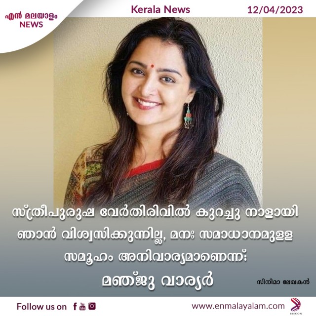 സ്ത്രീപുരുഷ വേര്തിരിവില് കുറച്ചു നാളായി ഞാന് വിശ്വസിക്കുന്നില്ല, മനഃസമാധാനമുള്ള സമൂഹം അനിവാര്യമാണെന്ന് മഞ്ജു വാര്യർ