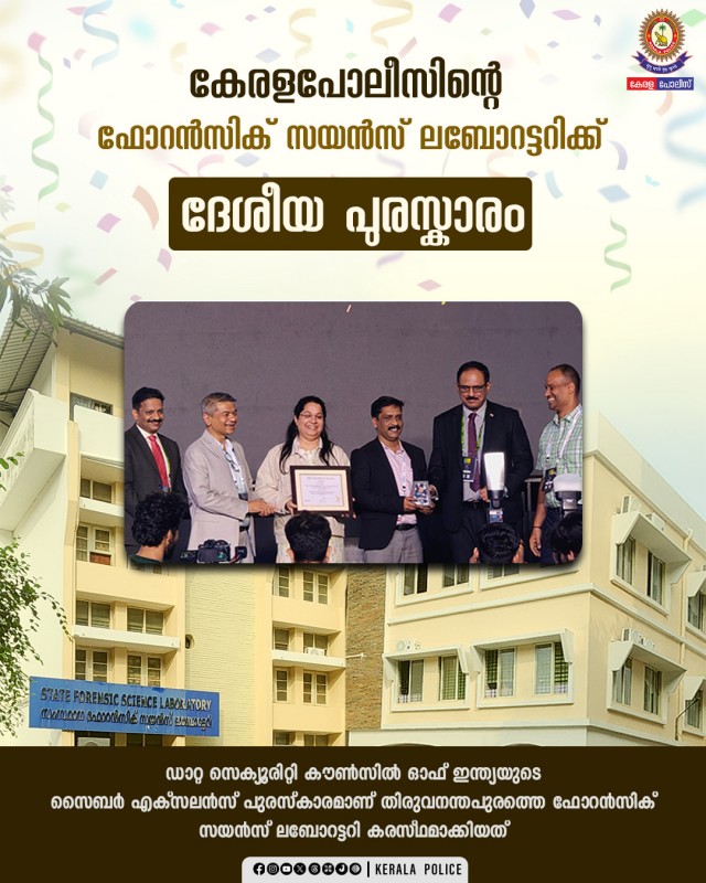 ഡാറ്റ സെക്യൂരിറ്റി കൗണ്സില് ഓഫ് ഇന്ത്യ നടത്തിയ മത്സരത്തില് തിരുവനന്തപുരത്തെ ഫോറന്സിക് സയന്സ് ലബോറട്ടറിക്ക് പുരസ്കാരം.