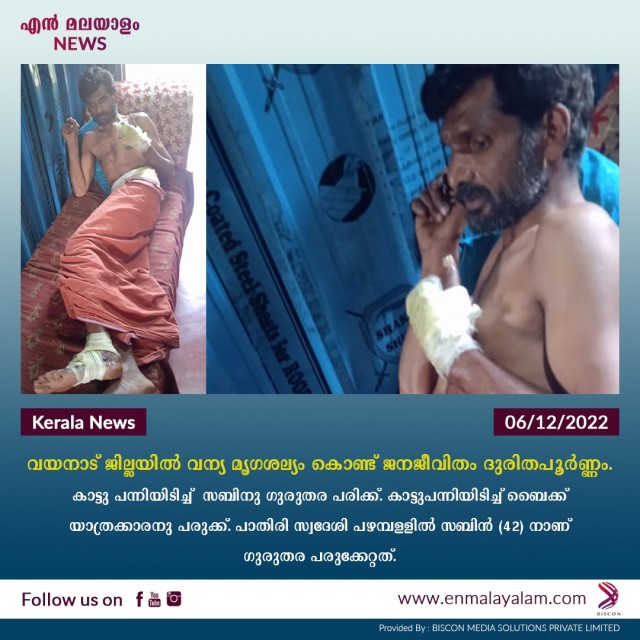 കാട്ടു പന്നിയിടിച്ച് സബിനു ഗുരുതര പരിക്ക്. കാട്ടുപന്നിയിടിച്ച് ബൈക്ക് യാത്രക്കാരനു പരുക്ക്. പാതിരി സ്വദേശി പഴമ്പള്ളിൽ സബിൻ ( 42 ) നാണ് ഗുരുതര പരുക്കേറ്റത്. രാവിലെ പണി സൈറ്റിലേക്കു പോകുമ്പോൾ മുള്ളൻ കൊല്ലിയിൽ വച്ചാണ് ബൈക്കിൽ കാട്ടുപന്നിയിടിച്ചത്. പന്നിയുടെ തല ബൈക്കിലുടക്കിയതിനാൽ പന്നി റോഡിലൂടെ ബൈക്ക് തലങ്ങും വിലങ്ങും വലിച്ചിഴച്ചു. സബിന്റെ ഹെൽമറ്റും തകർന്നു. ശരീരമാസകലം പരുക്കുണ്ട്. ബൈക്ക് പാടെ തകർന്നു. ഇയാളെ സാമുഹ്യാരോഗ്യ കേന്ദത്തിൽ പ്രവേശിപ്പിച്ചു.