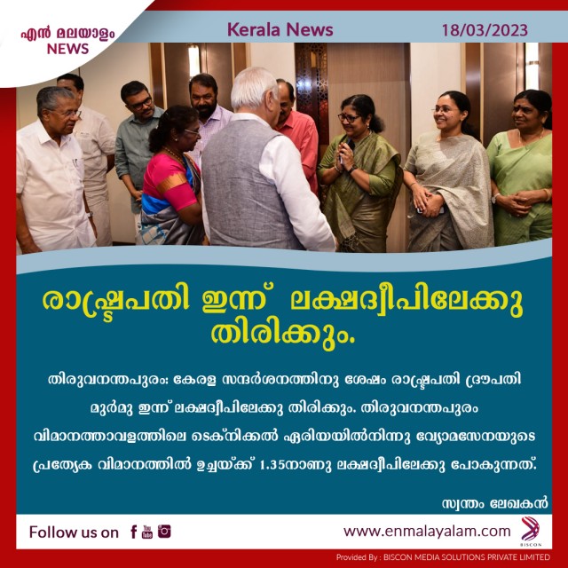 തിരുവനന്തപുരം: കേരള സന്ദർശനത്തിനു ശേഷം രാഷ്ട്രപതി ദ്രൗപതി മുർമു ഇന്ന് ലക്ഷദ്വീപിലേക്കു തിരിക്കും. തിരുവനന്തപുരം വിമാനത്താവളത്തിലെ ടെക്നിക്കൽ ഏരിയയിൽനിന്നു വ്യോമസേനയുടെ പ്രത്യേക വിമാനത്തിൽ ഉച്ചയ്ക്ക് 1.35നാണു ലക്ഷദ്വീപിലേക്കു പോകുന്നത്. ഇന്ന് രാവിലെ ഒമ്പതിന് രാഷ്ട്രപതിയും കുടുംബാംഗങ്ങളും കന്യാകുമാരി സന്ദർശിക്കുന്നുണ്ട്. ഇതിനായി തിരുവനന്തപുരം വിമാനത്താവളത്തിൽനിന്നു രാവിലെ 8.25നു ഹെലികോപ്റ്ററിൽ കന്യാകുമാരിയിലേക്കു പോകും. സന്ദർശന ശേഷം രാവിലെ 11.25നു തിരുവനന്തപുരത്തേക്കു മടങ്ങിയെത്തി ഉച്ചഭക്ഷണത്തിനു ശേഷമാണു ലക്ഷദ്വീപിലേക്കു തിരിക്കുന്നത്. ലക്ഷദ്വീപ് സന്ദർശനത്തിനു ശേഷം 21 ന് ഉച്ചയ്ക്ക് കേരളത്തിലെത്തുന്ന രാഷ്ട്രപതി കൊച്ചി അന്താരാഷ്ട്ര വിമാനത്താവളത്തിൽ നിന്ന് ഡൽഹിയിലേയ്ക്ക് മടങ്ങും.
