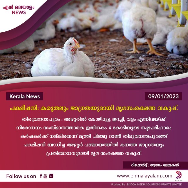 അഴൂര് പഞ്ചായത്തിന്റെ 10 കിലോമീറ്റര് ചുറ്റളവില് കോഴികള്, താറാവുകള്, അരുമപ്പക്ഷികള് എന്നിവയുടെ കടത്ത്, വില്പന, കൈമാറ്റം എന്നിവയും ജില്ലാ കളക്ടര് നിരോധിച്ചിട്ടുണ്ട്. മൃഗസംരക്ഷണ വകുപ്പിന്റെ റാപ്പിഡ് റസ്പോണ്സ് ടീമിനാണ് പക്ഷികളെ കൊല്ലുന്നതിനും ഒഴിവാക്കുന്നതിനമുള്ള ചുമതല. പക്ഷിപ്പനി ബാധിച്ച് സംസ്ഥാനത്ത് ഇതിനകം മരണപ്പെട്ടതും കൊന്നൊടുക്കിയതമായ പക്ഷികള്ക്കും നശിപ്പിക്കപ്പെട്ട മുട്ടകള്ക്കും നഷ്ടപരിഹാരം നല്കാനുള്ള നടപടികള് ഊര്ജിതമാക്കിയതായി മന്ത്രി ചിഞ്ചുറാണി പറഞ്ഞു. ഇക്കാര്യത്തില് കേന്ദ്ര സഹായത്തിനായി കാത്തു നില്കാതെ ആലപ്പുഴയിലും കോട്ടയത്തുമായി 4 കോടി രൂപ കര്ഷകര്ക്ക് വിതരണം ചെയ്തതായി മന്ത്രി അറിയിച്ചു.
