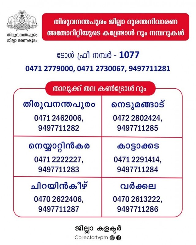 കനത്ത മഴയുടെ പശ്ചാത്തലത്തിൽ തിരുവനന്തപുരം ജില്ലയിലെ എല്ലാ താലൂക്കുകളിലും കൺട്രോൾ റൂമുകൾ പ്രവർത്തിക്കും. ജില്ലാ കളക്ടറേറ്റിലും തിരുവനന്തപുരം കോർപറേഷനിലും പ്രധാന കൺട്രോൾ റൂമുകൾ സജ്ജമാക്കും. പൊതുമരാമത്ത് വകുപ്പിന്റെ കൺട്രോൾ റൂം കെ.എസ്.ടി.പി. ഓഫീസിൽ ഉടൻ ആരംഭിക്കും.
