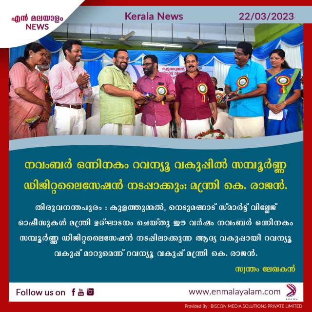 നവംബർ ഒന്നിനകം റവന്യൂ വകുപ്പിൽ സമ്പൂർണ്ണ ഡിജിറ്റലൈസേഷൻ നടപ്പാക്കും: മന്ത്രി കെ. രാജൻ.