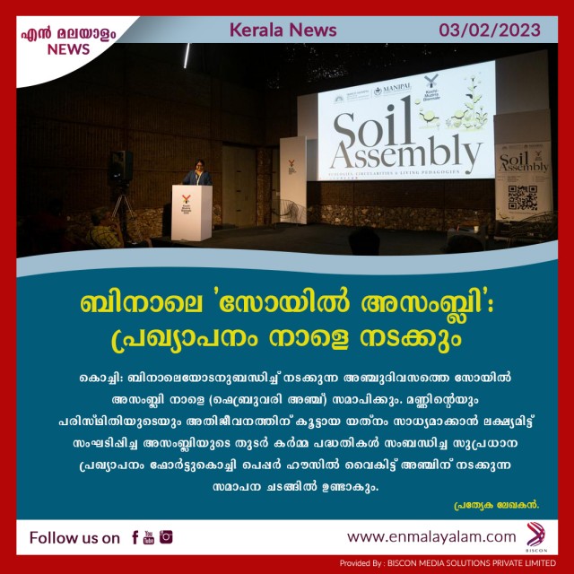 കൊച്ചി: ബിനാലെയോടനുബന്ധിച്ച് നടക്കുന്ന അഞ്ചുദിവസത്തെ സോയിൽ അസംബ്ലി നാളെ (ഫെബ്രുവരി അഞ്ച്) സമാപിക്കും. മണ്ണിന്റെയും പരിസ്ഥിതിയുടെയും അതിജീവനത്തിന് കൂട്ടായ യത്നം സാധ്യമാക്കാൻ ലക്ഷ്യമിട്ട് സംഘടിപ്പിച്ച അസംബ്ലിയുടെ തുടർ കർമ്മ പദ്ധതികൾ സംബന്ധിച്ച സുപ്രധാന പ്രഖ്യാപനം ഫോർട്ടുകൊച്ചി പെപ്പർ ഹൗസിൽ വൈകിട്ട് അഞ്ചിന് നടക്കുന്ന സമാപന ചടങ്ങിൽ ഉണ്ടാകും.
