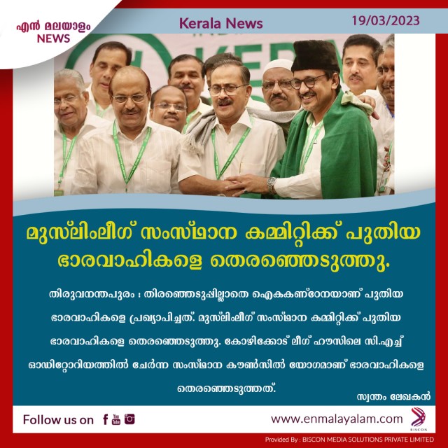 മുസ്ലിംലീഗ് സംസ്ഥാന കമ്മിറ്റിക്ക് പുതിയ ഭാരവാഹികളെ തെരഞ്ഞെടുത്തു.