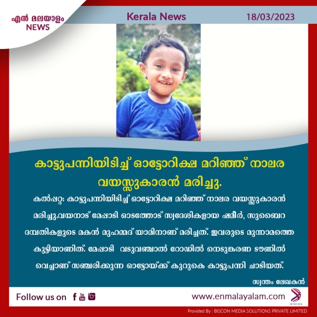 കാട്ടുപന്നിയിടിച്ച് ഓട്ടോറിക്ഷ മറിഞ്ഞ് നാലര വയസ്സുകാരൻ മരിച്ചു.