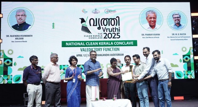 കോഴിക്കോട്: തദ്ദേശ സ്വയംഭരണ വകുപ്പിന്റെ മികച്ച സംരംഭക പുരസ്കാരം (സ്വകാര്യ ഏജന്സി) കോഴിക്കോട് ആസ്ഥാനമായി പ്രവര്ത്തിക്കുന്ന വേസ്റ്റ് മാനേജ്മെന്റ് കമ്പനിയായ ഗ്രീന് വേംസ് പ്രൈവറ്റ് ലിമിറ്റഡിന്. മാലിന്യ മുക്തം നവകേരളം ക്യാംപെയ്നിന്റെ ഭാഗമായാണ് പുരസ്കാരം. പുരസ്കാരം ചീഫ് സെക്രട്ടറി ശാരദാ മുരളീധരനില് നിന്ന് ഗ്രീന് വേംസ് സിഇഒ ജാബിര് കാരാട്ട് ഏറ്റുവാങ്ങി. തിരുവനന്തപുരം കനകക്കുന്നില് നടന്ന വൃത്തി 2025 കോണ്ക്ലേവിന്റെ സമാപന സമ്മേളനത്തില് വച്ചായിരുന്നു പുരസ്കാര വിതരണം. മന്ത്രി എംബി രാജേഷ്, തദ്ദേശ സ്വയംഭരണ വകുപ്പ് സ്പെഷ്യല് സെക്രട്ടറി അനുപമ ടിവി തുടങ്ങിയവര് പങ്കെടുത്തു.
