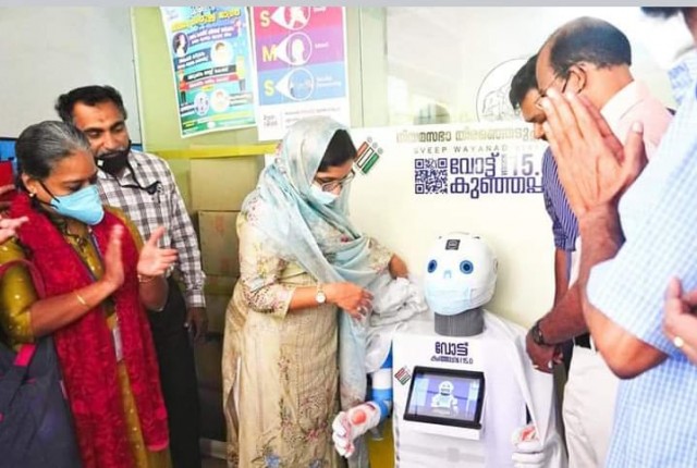 വയനാട് ജില്ലയിൽ സ്വീപ്പ് ഇലക്ഷൻ പദ്ധതിയുടെ ഭാഗമായി തെരഞ്ഞെടുപ്പ് ബോധവൽക്കരണത്തിന് ആൻഡ്രോയ്ഡ് കുഞ്ഞപ്പന്റെ രൂപസാദൃശ്യമുള്ള റോബോട്ടെത്തി . തലപ്പുഴ ഗവൺമെന്റ് എൻജിനീയറിങ് കോളേജിലെ പ്രൊഫസർ : അനസ് എം.എം (എൻ.എസ്. എ സ് പ്രോഗ്രാം ഓഫീസർ )ന്റെ നേതൃത്വത്തിൽ സേവ്യർ സി.ജെ, വിപിൻരാജ്, മഹേഷ് ബാബു എന്നിവർ അടങ്ങുന്ന ടീം നിർമ്മിച്ച റോബോർട്ട് ആണ് " വോട്ട് കുഞ്ഞപ്പൻ വേർഷൻ 15.0 ". വയനാട് ജില്ലാ കലക്ടറേറ്റിൽ നടന്ന ചടങ്ങിൽ ജില്ലാ കലക്ടർ ഡോക്ടർ ആദില അബ്ദുള്ള, IASതാര എന്നിവരാണ് വോട്ട് കുഞ്ഞപ്പനെ സ്വീകരിച്ചത് .