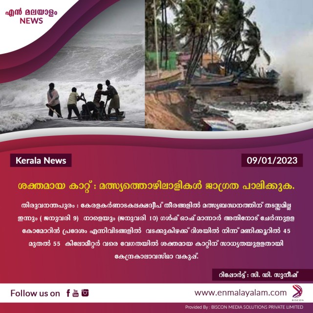 തിരുവനന്തപുരം : കേരള-കർണാടക-ലക്ഷദ്വീപ് തീരങ്ങളിൽ മത്സ്യബന്ധനത്തിന് തടസ്സമില്ല ഇന്നും ( ജനുവരി 9) നാളെയും (ജനുവരി 10) ഗൾഫ് ഓഫ് മാന്നാർ അതിനോട് ചേർന്നുള്ള കോമോറിൻ പ്രദേശം എന്നിവിടങ്ങളിൽ വടക്കുകിഴക്ക് ദിശയിൽ നിന്ന് മണിക്കൂറിൽ 45 മുതൽ 55 കിലോമീറ്റർ വരെ വേഗതയിൽ ശക്തമായ കാറ്റിന് സാധ്യതയുള്ളതായി കേന്ദ്രകാലാവസ്ഥാ വകുപ്പ്. ഈ ദിവസങ്ങളിൽ മുന്നറിയിപ്പുള്ള പ്രദേശങ്ങളിൽ മത്സ്യബന്ധനത്തിന് പോകരുതെന്ന് ജില്ലാ കളക്ടർ അറിയിച്ചു. അതേസമയം കേരള-കർണാടക-ലക്ഷദ്വീപ് തീരങ്ങളിൽ മത്സ്യബന്ധനത്തിന് തടസ്സമില്ലെന്നും അറിയിപ്പിൽ പറയുന്നു.