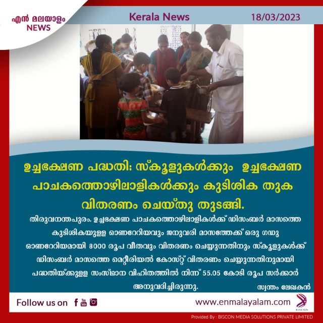 തിരുവനന്തപുരം: ഉച്ചഭക്ഷണ പദ്ധതിയിൽ സ്കൂളുകൾക്കും ഉച്ചഭക്ഷണ പാചകത്തൊഴിലാളികൾക്കും കുടിശിക തുക വിതരണം ചെയ്തു തുടങ്ങി. ഉച്ചഭക്ഷണ പാചകത്തൊഴിലാളികൾക്ക് ഡിസംബർ മാസത്തെ കുടിശികയുള്ള ഓണറേറിയവും ജനുവരി മാസത്തേക്ക് ഒരു ഗഡു ഓണറേറിയമായി 8000 രൂപ വീതവും വിതരണം ചെയ്യുന്നതിനും സ്കൂളുകൾക്ക് ഡിസംബർ മാസത്തെ മെറ്റീരിയൽ കോസ്റ്റ് വിതരണം ചെയ്യുന്നതിനുമായി പദ്ധതിയ്ക്കുള്ള സംസ്ഥാന വിഹിതത്തിൽ നിന്ന് 55.05 കോടി രൂപ സർക്കാർ അനുവദിച്ചിരുന്നു. മാർച്ച് 16 ന് പൊതുവിദ്യാഭ്യാസ ഡയറക്ടറുടെ സിംഗിൾ നോഡൽ അക്കൗണ്ടിലേക്ക് ലഭ്യമായ ഈ തുകയാണ് സ്കൂളുകൾക്കും ഉച്ചഭക്ഷണ പാചകത്തൊഴിലാളികൾക്കും വിതരണം ചെയ്ത് തുടങ്ങിയത്. പദ്ധതിയ്ക്കുള്ള രണ്ടാം ഗഡു കേന്ദ്രവിഹിതം ഉടൻ ലഭിക്കുമെന്ന് പ്രതീക്ഷിക്കുന്നു. ആയത് ലഭ്യമായാൽ സ്കൂളുകൾക്കുള്ള ജനുവരി, ഫെബ്രുവരി മാസങ്ങളിലെ മെറ്റീരിയൽ കോസ്റ്റും പാചകത്തൊഴിലാളികൾക്കുള്ള ജനുവരി മാസത്തെ ബാലൻസ് ഓണറേറിയവും ഫെബ്രുവരി മാസത്തെ പൂർണ്ണ ഓണറേറിയവും വിതരണം ചെയ്യുന്നതാണ്.